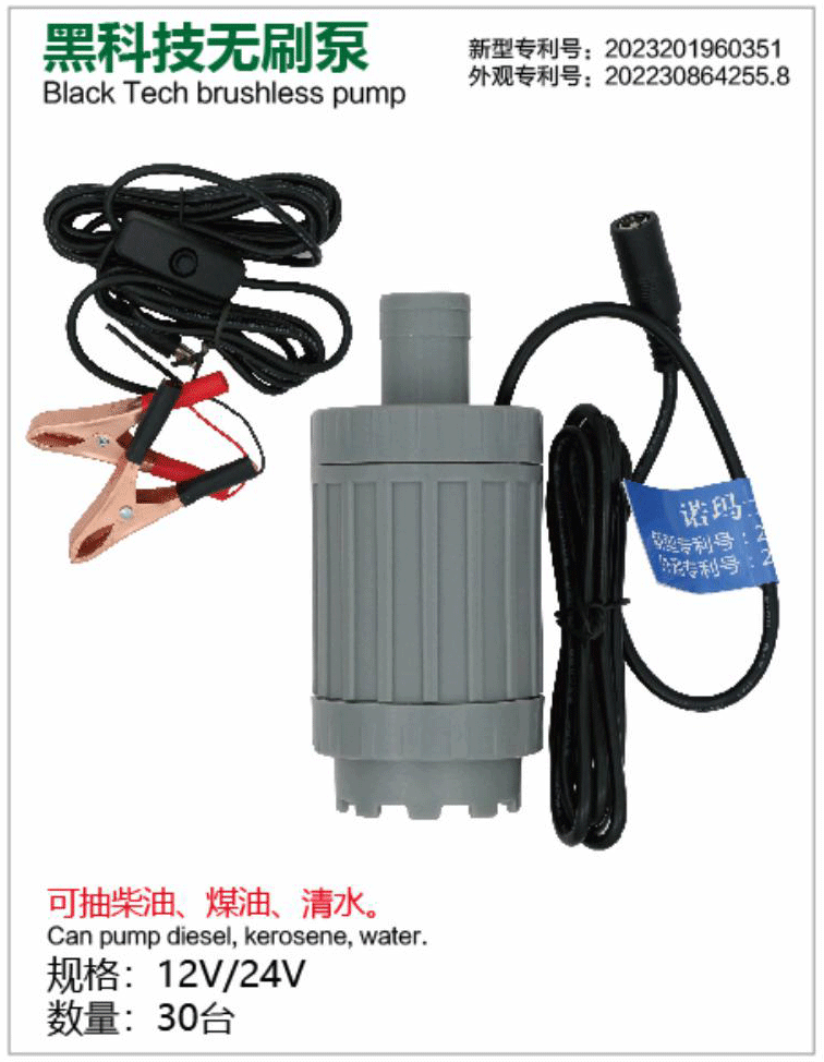 The Huying Pump Industry Black Tech Brushless Pump is an ultra-compact DC electric pump powered by advanced brushless motor technology, supporting 12V/24V DC (compatible with car/truck batteries), with moderate power (typically 80-150W range) and equipped with battery clamps and extended power cord. Featuring a new utility patent (Patent No. 20233201960351) and design patent (Patent No. 202230864255.8), it is optimized for diesel, kerosene, and clean water. Ideal for farms, marine use, field repairs, emergency transfer, and outdoor applications. As a flagship in Huying's "Black Tech" series, this brushless pump offers superior durability, lower noise, higher efficiency, and longer life compared to traditional brushed pumps—compact, lightweight, and exceptional value for high-frequency or space-limited use.
