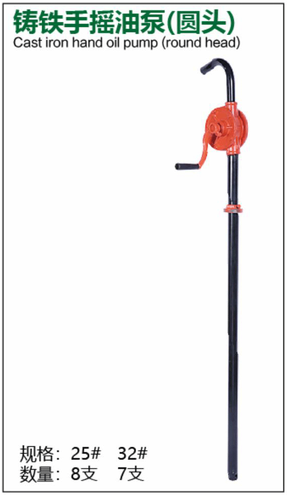 The Huying Pump Industry Cast Iron Hand Crank Oil pump (Round Head) is a classic, durable, and economical manual hand-crank oil extractor featuring high-strength cast iron pump head with round design, equipped with hand crank, anti-slip handle, and precision gear transmission, total length approx. 1.2 meters. Available in 25# and 32# specifications (different port sizes and flow rates). Specifically designed for fast extraction of diesel, kerosene, engine oil, hydraulic oil, waste oil, antifreeze, and other medium-low viscosity oils from 20L-200L drums. Fully manual crank operation—no electricity needed, excellent sealing, smooth flow, and high efficiency—making it an essential tool for auto repair shops, farms, construction sites, warehouses, marine, and outdoor emergencies. As a traditional best-seller in Huying's manual Oil pump series, this round head cast iron model is renowned for its robust cast iron head, stable round design, and powerful output—a long-time classic from our source factory.