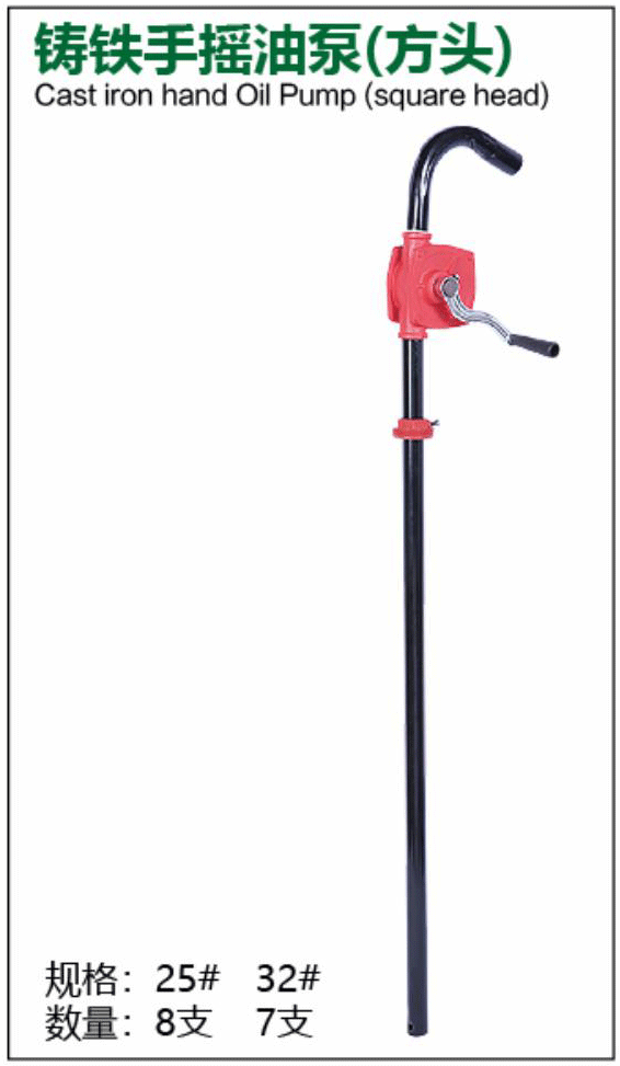 The Huying Pump Industry Cast Iron Hand Crank Oil pump (Square Head) is a classic, durable, and economical manual hand-crank oil extractor featuring high-strength cast iron pump head with square design, equipped with hand crank, anti-slip handle, and precision gear transmission, total length approx. 1.2 meters. Available in 25# and 32# specifications (different port sizes and flow rates). Specifically designed for fast extraction of diesel, kerosene, engine oil, hydraulic oil, waste oil, antifreeze, and other medium-low viscosity oils from 20L-200L drums. Fully manual crank operation—no electricity needed, excellent sealing, smooth flow, and high efficiency—making it an essential tool for auto repair shops, farms, construction sites, warehouses, marine, and outdoor emergencies. As a traditional best-seller in Huying's manual Oil pump series, this square head cast iron model is renowned for its robust cast iron head, stable square design, and powerful output—a long-time classic from our source factory.