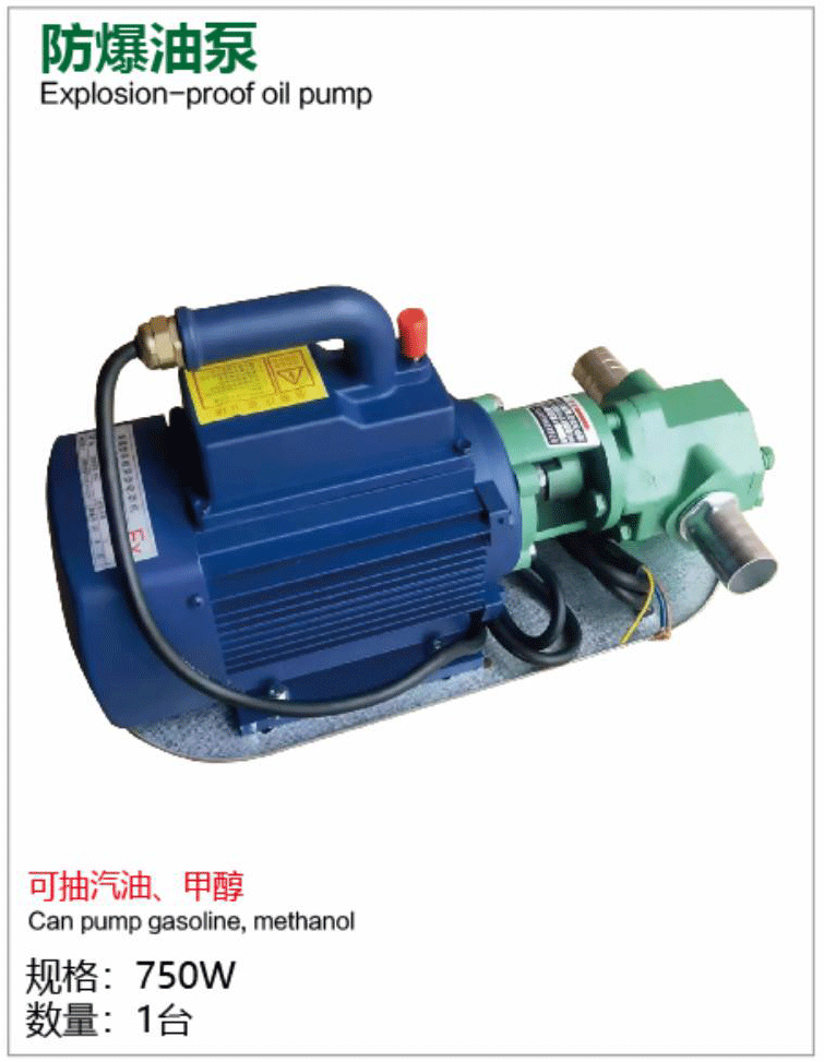 The Huying Pump Industry Explosion-proof Oil Pump is a professional-grade explosion-proof electric pump with 750W power, powered by 220V AC, featuring an explosion-proof motor and certified structure (EX marked). Designed specifically for safely transferring highly flammable and explosive liquids like gasoline and methanol, it offers secure, efficient pumping in hazardous environments. Ideal for chemical plants, petroleum facilities, laboratories, gas stations, marine applications, and industrial sites handling volatile solvents. As an explosion-proof model in Huying's professional pump series, this pump strictly complies with explosion-proof standards, combining powerful performance and reliable self-priming for high-risk fluid transfer.