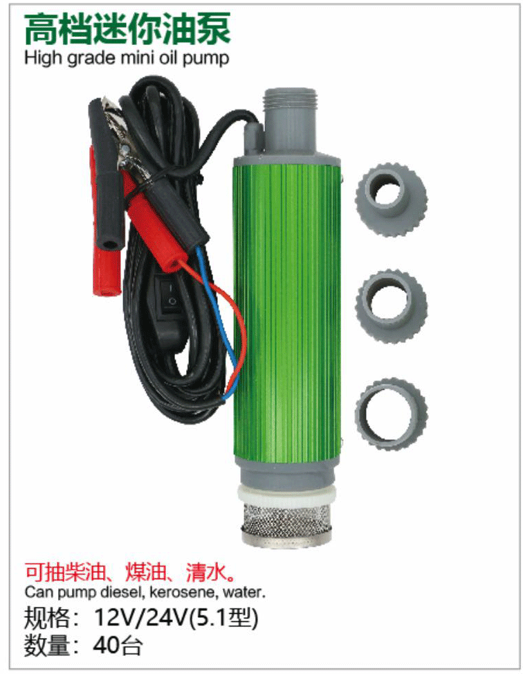 The Huying Pump Industry High-Grade Mini Oil pump (5.1 type) is a premium portable DC electric pump powered by 12V/24V (compatible with car/truck batteries), featuring aviation-grade aluminum alloy anodized body, stainless steel filter, battery clamps, and extended power cord. Optimized for diesel, kerosene, and clean water, it delivers superior durability, excellent heat dissipation, and ultra-lightweight performance. Ideal for farms, marine use, field repairs, emergency refueling, and outdoor multi-purpose extraction. As the "high-grade" flagship in Huying's mini series, this pump uses premium materials and craftsmanship for enhanced quality, stability, and longevity—perfect for users demanding superior build and experience in compact, mobile applications.