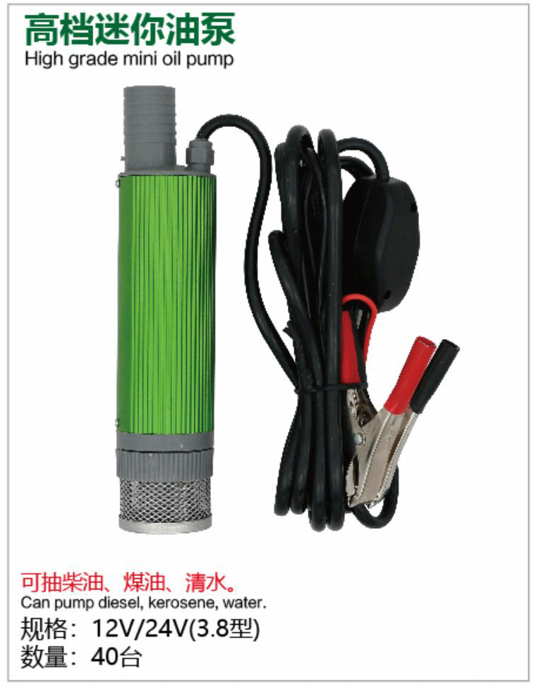 The Huying Pump Industry High-Grade Mini Oil pump (3.8 type) is an upgraded premium portable DC electric pump powered by 12V/24V (compatible with car/truck batteries), featuring aviation-grade aluminum alloy body, stainless steel filter, battery clamps, and extended power cord. Optimized for diesel, kerosene, and clean water, it offers superior durability, heat dissipation, and lightweight performance. Ideal for farms, marine use, field repairs, emergency refueling, and outdoor multi-purpose extraction. As the "high-grade" flagship in Huying's mini series, this pump uses premium materials and craftsmanship for enhanced quality, stability, and longevity—perfect for users demanding superior build and performance in compact, mobile applications.