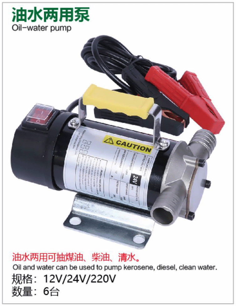 The Huying Pump Industry Oil-Water Dual-Use Pump is a versatile portable electric pump designed for dual-medium transfer, handling diesel, kerosene, and clean water. It supports 12V/24V/220V multi-voltage power supply with battery clamps and a convenient yellow handle for easy vehicle or household connection. As a practical model in Huying's professional pump series, this pump features oil-water compatibility to expand application flexibility, ideal for scenarios requiring both fuel and water handling, such as agricultural irrigation, equipment cleaning, and fuel transfer—offering a reliable, cost-effective one-tool-for-multiple-tasks solution.